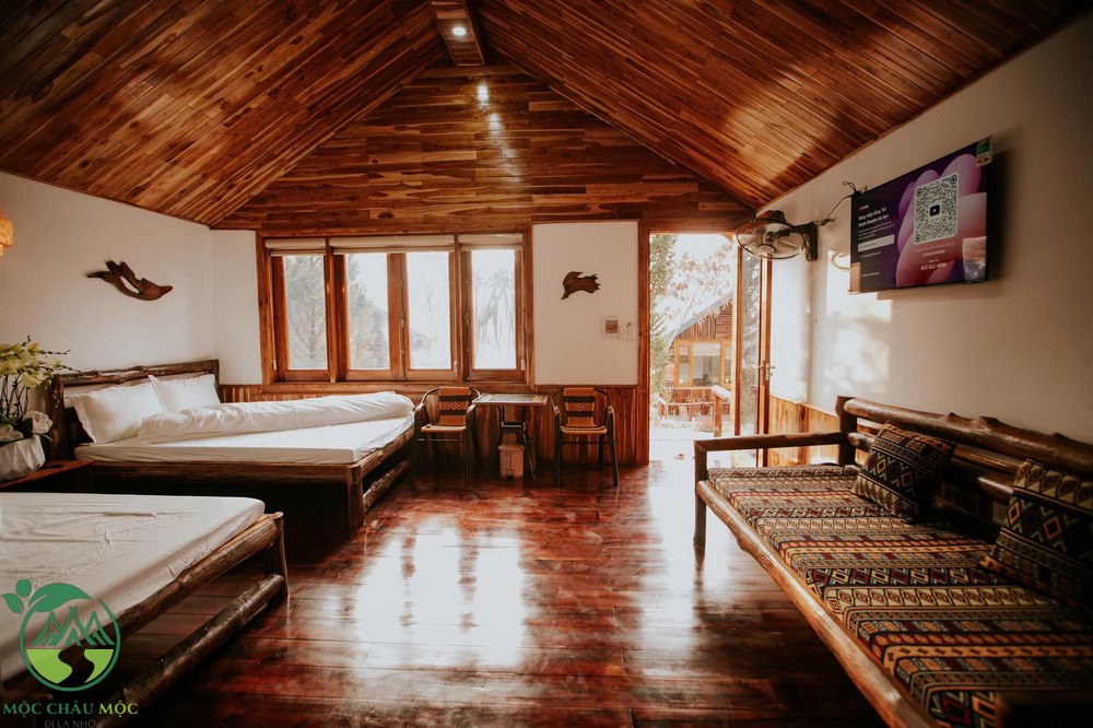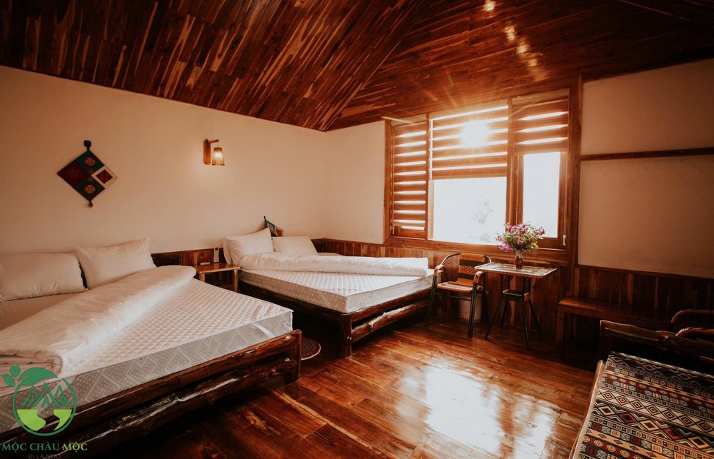 Homestay Kỳ Duyên 171 – nằm ngay cửa ngõ Khu du lịch quốc gia Mộc Châu có không gian rộng gần 1ha với các căn bungalow riêng biệt hài hòa thiên nhiên và cả các nhà sàn cộng đồng đẹp đẽ, rộng rãi.